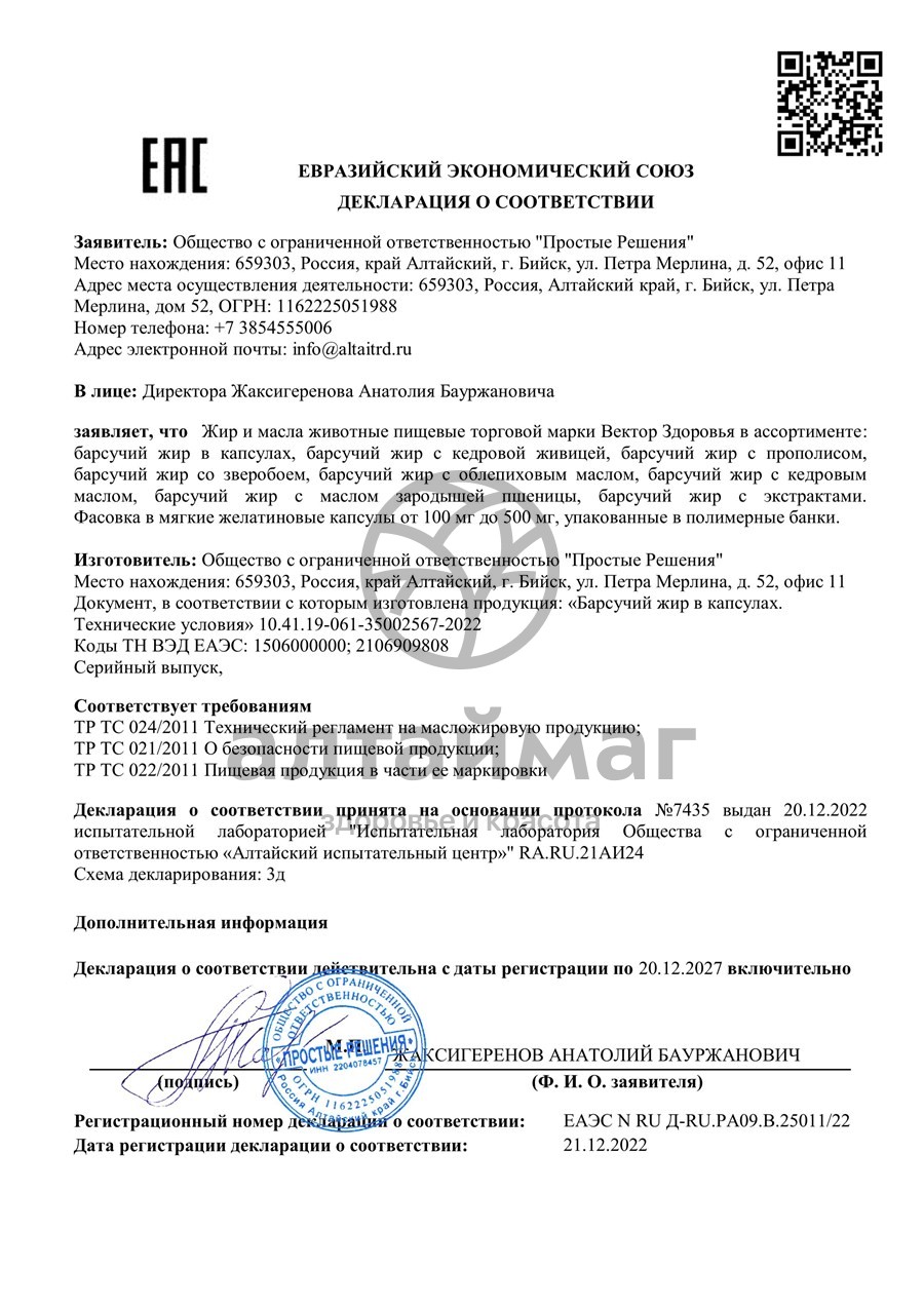 Есть вопросы по товару "Барсучий жир Вектор здоровья 100 капсул"?