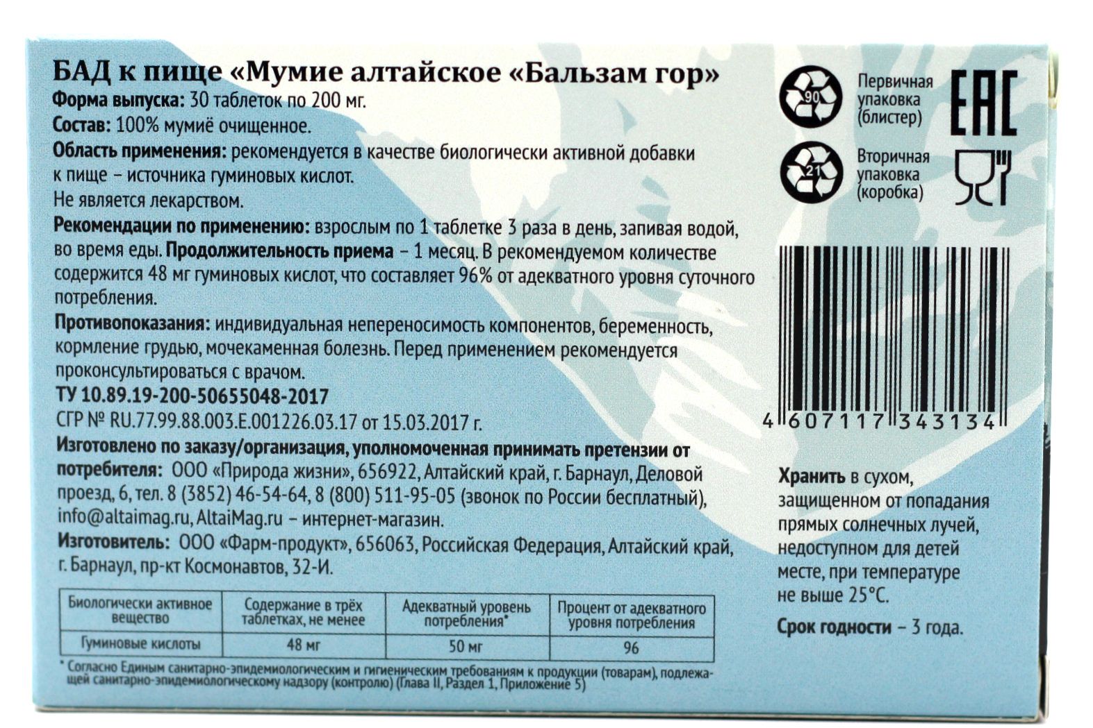 Есть вопросы по товару "Мумие АлтайМаг 30 таблеток по 0,2 г"?